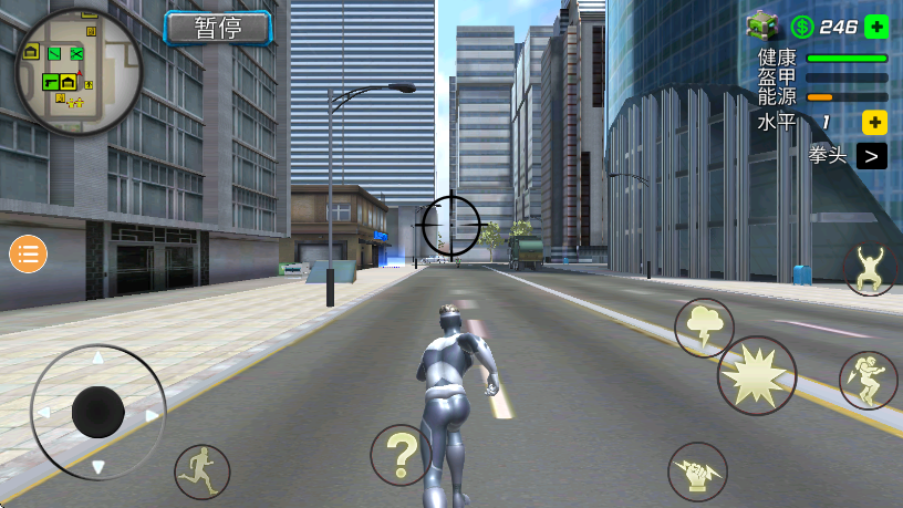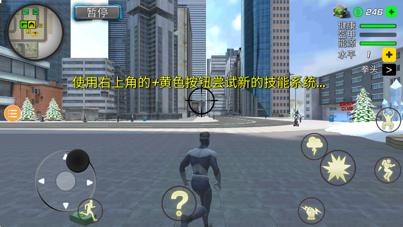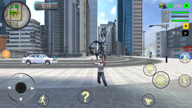 摆荡技巧:靠近高楼边缘时,点击“绳索”按钮即可自动抓取墙面,长按可延长摆动距离。建议在高楼密集区多练习连续摆荡,提升空中机动性。