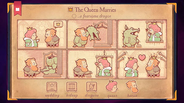 1、游戏以漫画格子为舞台,玩家需将角色(如国王、女巫、骑士)与场景(爱情、死亡、审判)按顺序排列,构建逻辑自洽的故事,用视觉语言“写”出剧情。