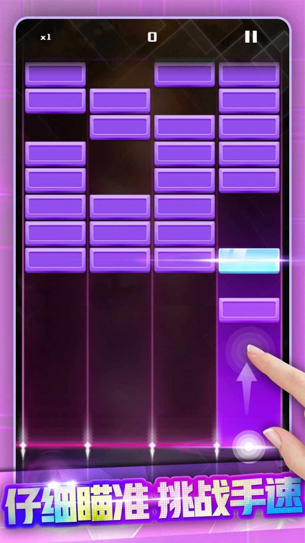 4、音乐节奏驱动操作:玩家需在电音风格的背景音乐中,根据节拍滑动屏幕发射小球或积木,精准击碎下落砖块,实现“听音击砖”的沉浸式操作。