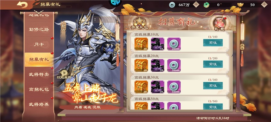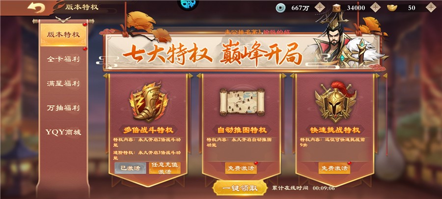 4、开局即巅峰,福利拉满:上线赠送倾国倾城·甄姬、百连抽与七大特权;挂机即领三种招募各100抽+全套紫色神装;通关主线可得10000高级招募+10万现金券,资源获取极为丰厚。