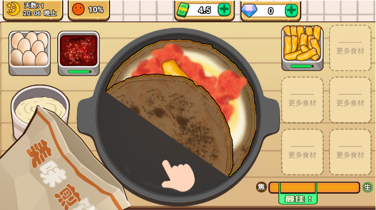 4、制作不同口味的煎饼来满足顾客的所有需求,提高自己煎饼摊的收益解锁更多食材。