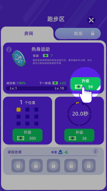 4、提升健身房的等级,不仅能够扩大场地的面积,而且还能布置更多增加营收的装饰