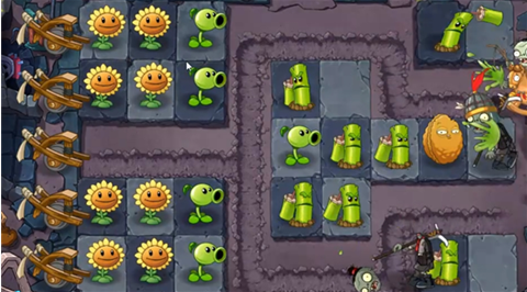 5、秦始皇陵1-5关卡:由于本关卡右侧地图只有一个T形区域可以防止,可以布置近战攻击的植物,左侧仍然是向日葵与豌豆射手,需要注意持盾僵尸的进攻。