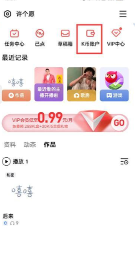 2、在个人中心页面,找到并点击【K币管理】;