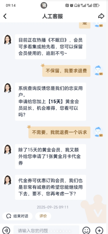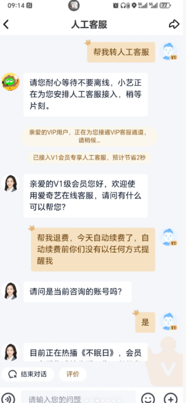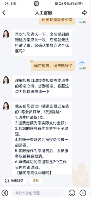 2. 在帮助与反馈里,选择“在线客服”,直接要求转人工客服说明情况。(如上客服开出各种优惠诱惑要不是另一个账号也是会员真的很心动啊!大家可以根据自己实际情况来决定要不要退款哈)