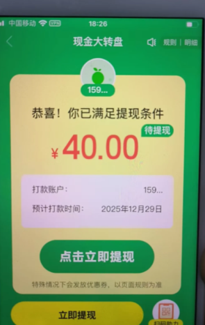 我在开年上班第一天下午,连续提现了三次60。是需要短时间内有十几个人助力就可以成功(貌似是在那个奖励时间里面,大概四十分钟),超过一定时间出现第三种收集物品就很难很难。 我在第五次,应该是24小时重启大转盘,短时间内十几个人助力,也提现成功了。