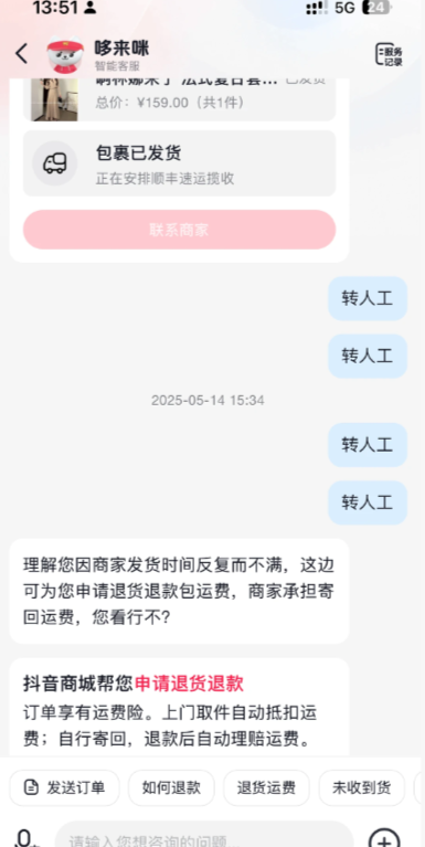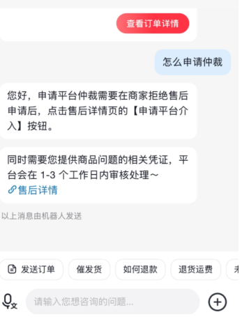 个人主页右上角三个横线,点击,会看到我的客服,然后选择自己要咨询的订单,最后,要像我一样,不停的发“转人工”三个字,不停的发,知道给你发消息的不再是机器人才是转接成功,跟客服描述事情原委,如果商家拒绝平台的处理或者拒绝售后,会有“申请平台介入”几个字,就可以发起仲裁。