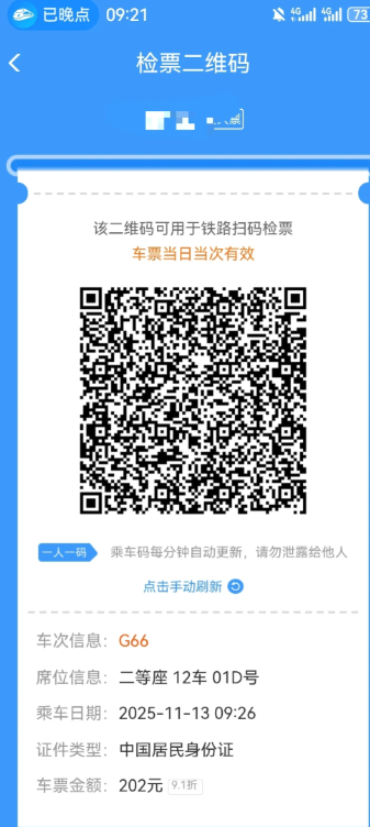 这个临时身份证明申请之后,能用24小时,但是二维码会半个小时更新,所以需要刷的时候要提前调一下。 在“本人车票”中找一下车票,点“二维码检票”。就可以了。