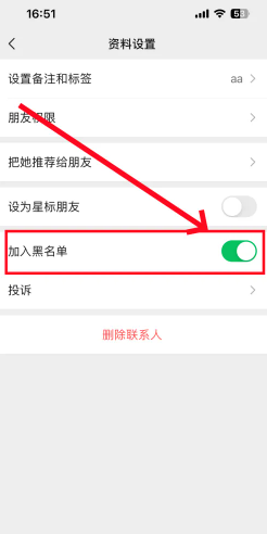 3.在资料设置中,开启“加入黑名单”,就可以拉黑这个好友了。