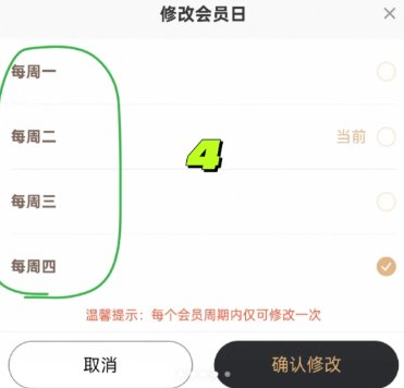 4. 选择会员日(下方提示:一年只能修改一次),点击进去,会弹出可选择日期