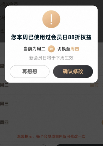 修改时需注意,盒马X会员日的更改并非没有限制,每年只能修改一次会员日,且只能修改在周一至周四,大家根据自己的情况修改。