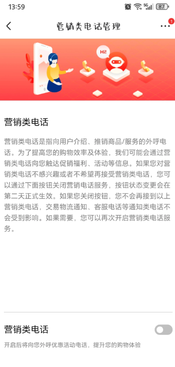 2,京东APP-我的-设置-隐私设置-商业性电话管理-关闭“营销类电话”(如图)