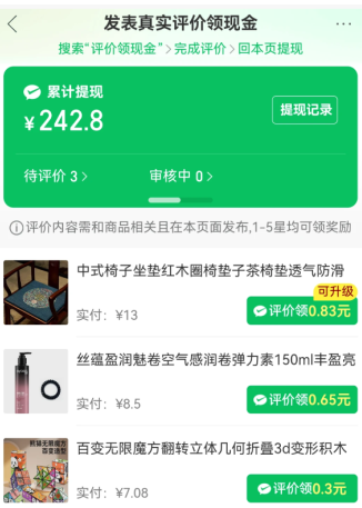 另外评价打款别急着评,搜索评价领现金可能还有'可升级'多几毛几块的呢