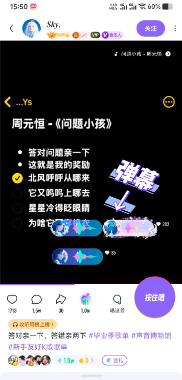 这个软件还可以给别人唱“弹幕”。唱上去被作品博主选中,就可以上作品标记。下图