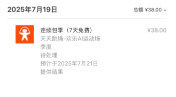 建议各位以后都不要开通天天跳绳的会员了 (特别是7天试用)。今天下午,我开通了天天跳绳软件的7天试用会员,下面写着7天免费试用,至 到期后以38的价格连续包季后面我就点击了确认的按扭,结果就直接通过绑定的支付宝扣款38元;