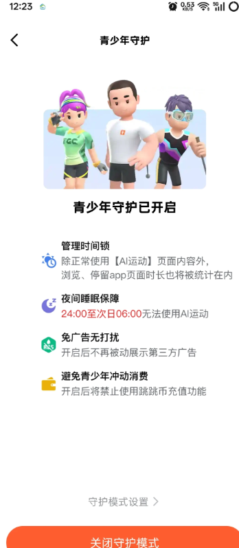 我的-设置-青少年守护,这里点击开启,设置密码,开始享受清爽的运动打卡吧