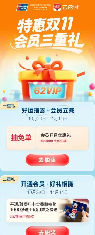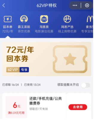 云闪付的“62VIP”,我觉得它是所以VIP里最有价值的VIP,就说每月给的6元信用卡还款券,一年72块钱就可以覆盖62元的会员费了。并且多数情况,大家开通会员时都是有一定优惠的(我一般是45元开通的)。