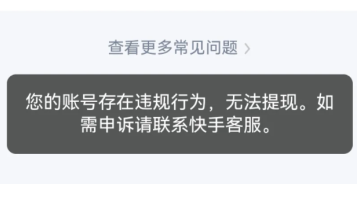 近日有小伙伴称今天想提现,结果突然这样提示,去问快手客服,就是一直重复让去看规则,建议老铁后续多多遵守活动规则。去看了,一大篇,也看不出违反了哪条,让客服明确说出来违反了什么规定,就是不说,就来来回回重复那几句话。真合着用户连了解违反哪条规定的权利都没有