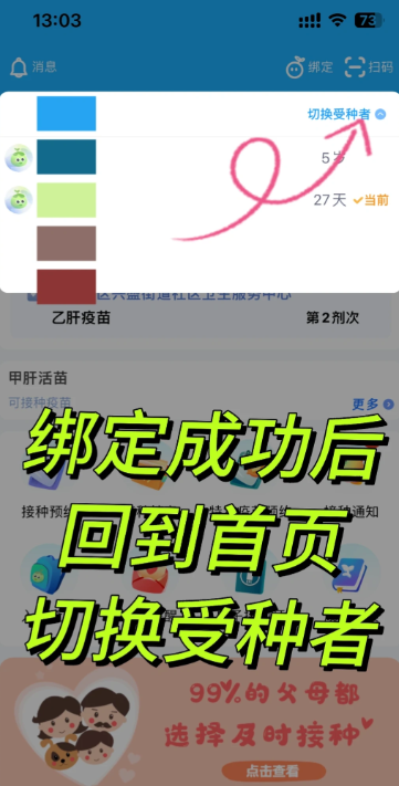 4,可接种疫苗 绑定成功后,回到首页,切换受种者