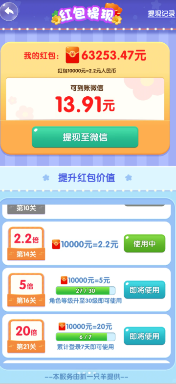 提现500的要求是要达到30级,提现套路 小于1元的关卡奖励可以实时发放,大于30元的提现 先是初步两日后到账,两日后必因额度限制打款失败,可以手动发起重试。重试后告诉你预期两日后到账(数据陷阱15%72小时到账,85%到某关提前到账)。等过到对应关卡后,二次数据陷阱(30级可到帐)。此时应当离30级差几级了,前几级都只是时间问题,最后一级直接999关才能过,也就是永远得不到…… 这中间还要夹杂着各种特定关卡结束不接算,需要重新过,各种bug导致的广告看了不生效。