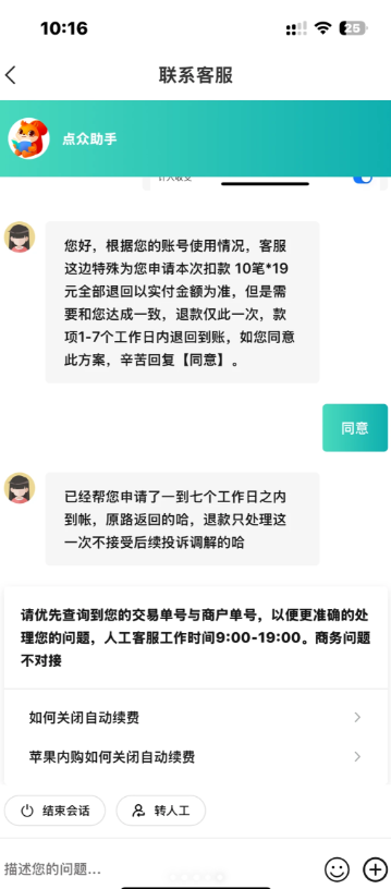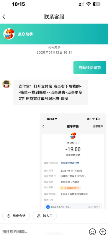打开点众小说app,联系客服,输入自动续费,会有官方的客服联系你的;
