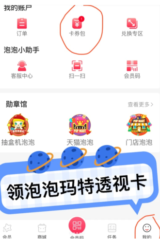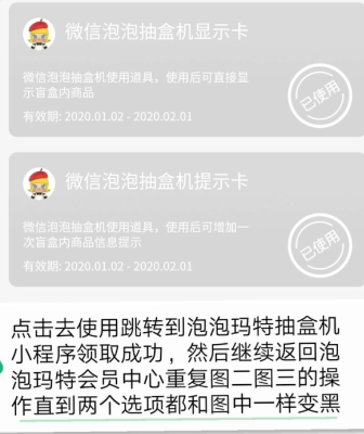 点击图三中的两个卡片选项去使用跳转至泡泡玛特抽盒机即为领取成功(之后可以在抽盒机的个人中心卡券包中查看)